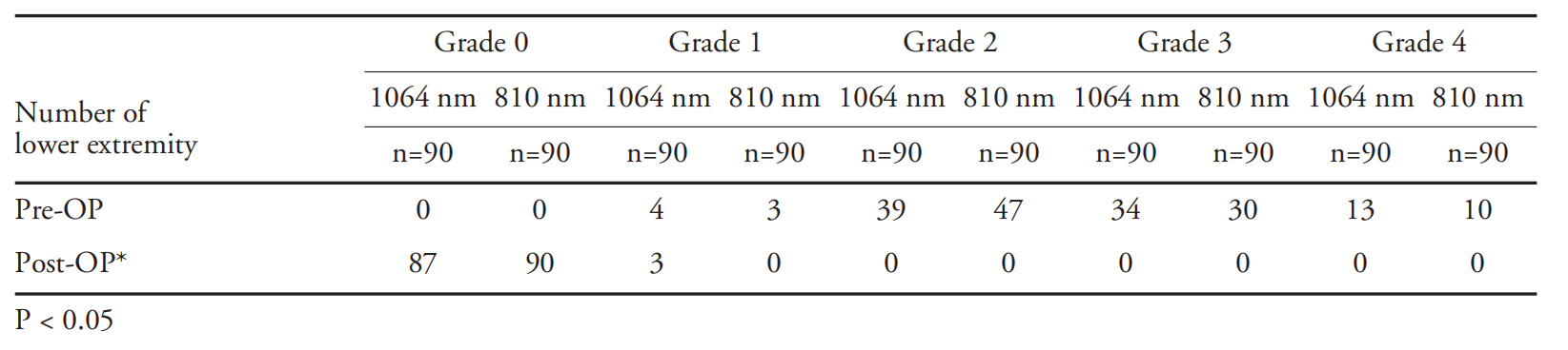 在最終結(jié)果的嚴(yán)重程度評分中,EVLP-1064nm組有3條腿(3.3%)得分為1,87條腿得分為0。EVLP-810nm組中有90條腿(100%)得分為0。這種差異非常顯著(x2 = 37.154,p = 0.001),表明EVLP-810nm組的改善更大。