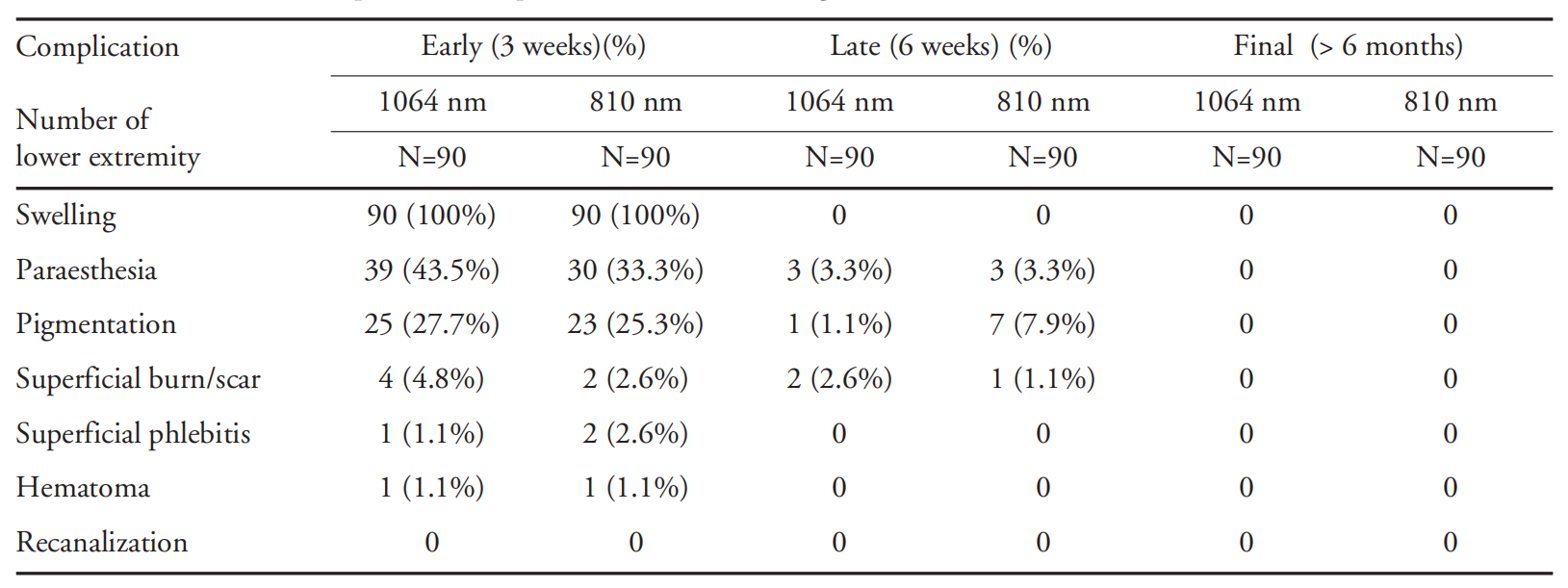 來自臺灣的醫(yī)學(xué)團(tuán)隊研究比較了波長1064nm與810nm的激光靜脈腔內(nèi)閉合術(shù)(EVLP)對大量患者治療靜脈曲張的療效和安全性。主要功效測量是基于Hach的EVLP-1064nm分類系統(tǒng)對反應(yīng)評分進(jìn)行定量評估,并在盲法基礎(chǔ)上與EVLP-810nm進(jìn)行比較。此外,還對每個治療組的安全性進(jìn)行了評估。